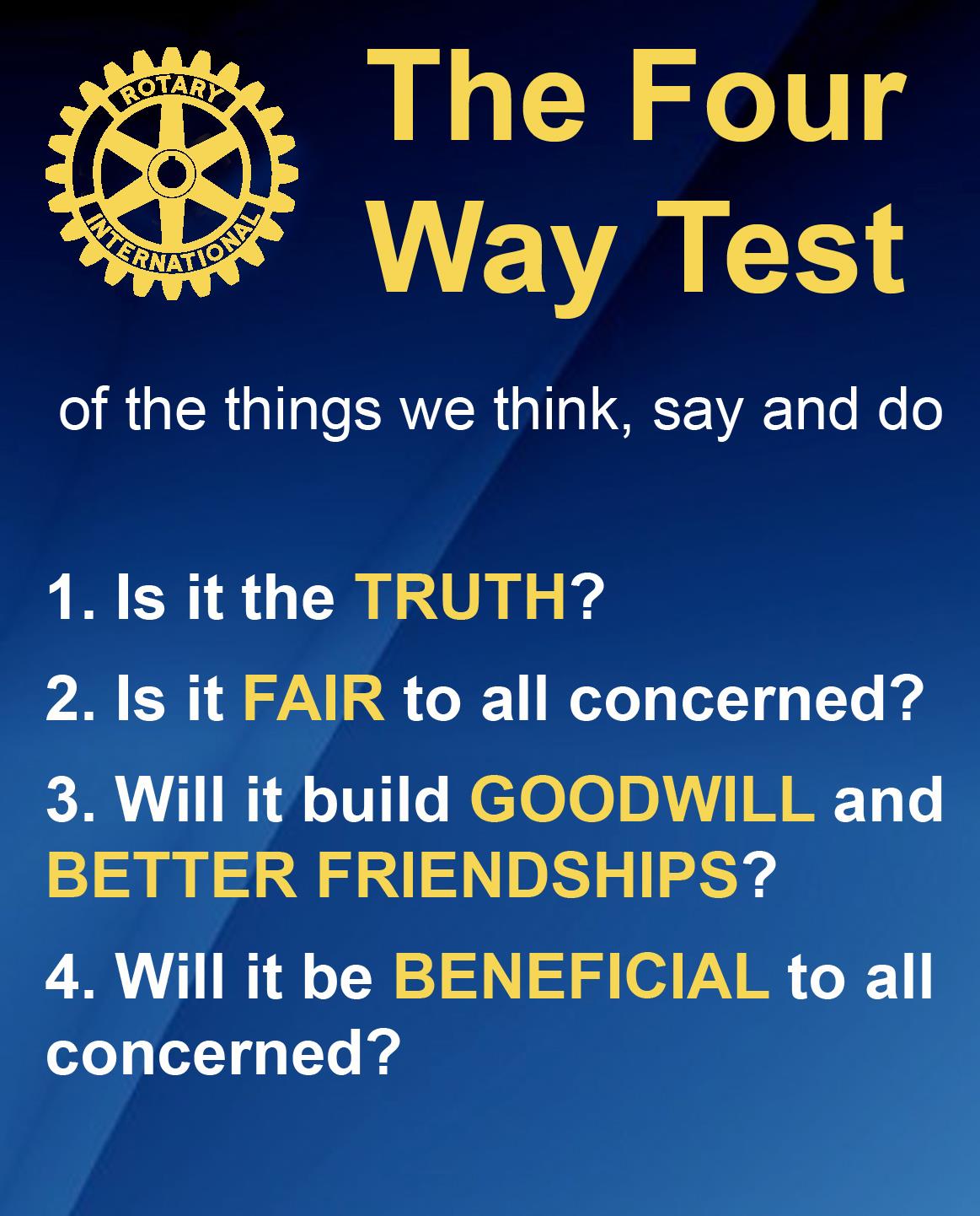 Considerable time was spent in developing four short questions which now make up the Four-Way Test. Here are the four questions: